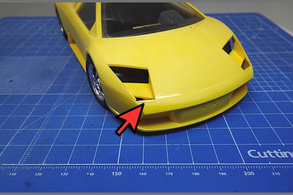 普通の組み立てでは、多少フロントバンパーにズレがあり、この部分を直しています。修正にはバンパー全体的に細かな加工が必要になってきます。(難しくはありません、少し削るだけ)