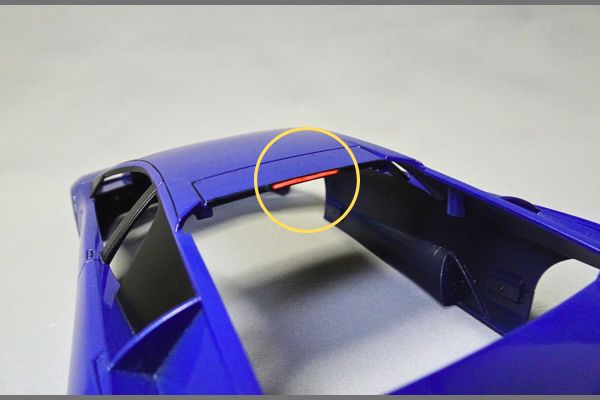 リアゲート部分にあるルーフブレーキランプは、デカールが用意されていましたが、組み立て途中で剥がれてしまったので、塗装とレジンを使った加工をほどこしました。