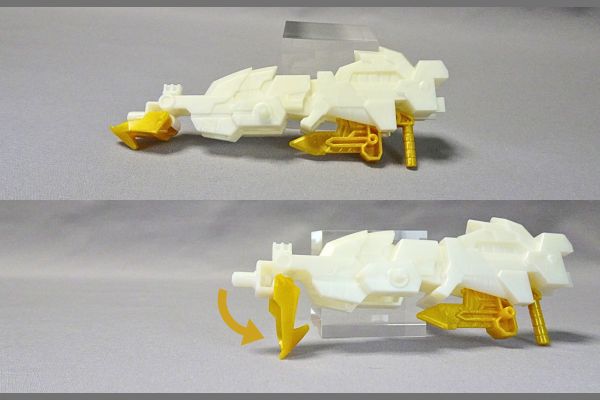 フレアーデバイスの先端にある砲口のパーツは軸で組み立てになっていて上下可動ができ、その下にあるゴールドのパーツも上下可動ができます。